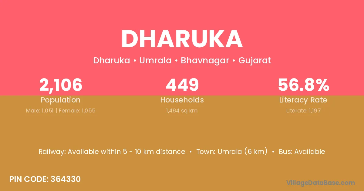Umrala (6 km) is the nearest town to Dharuka village for major economic activities and is located approximately 6 km away.