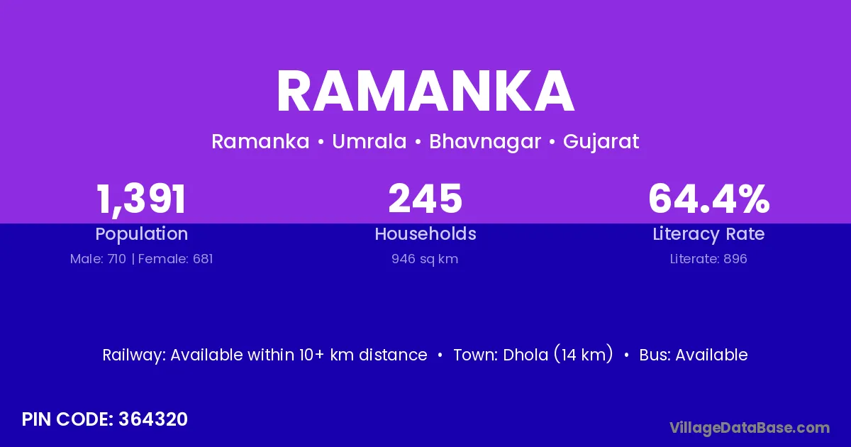 Dhola (14 km) is the nearest town to Ramanka village for major economic activities and is located approximately 14 km away.