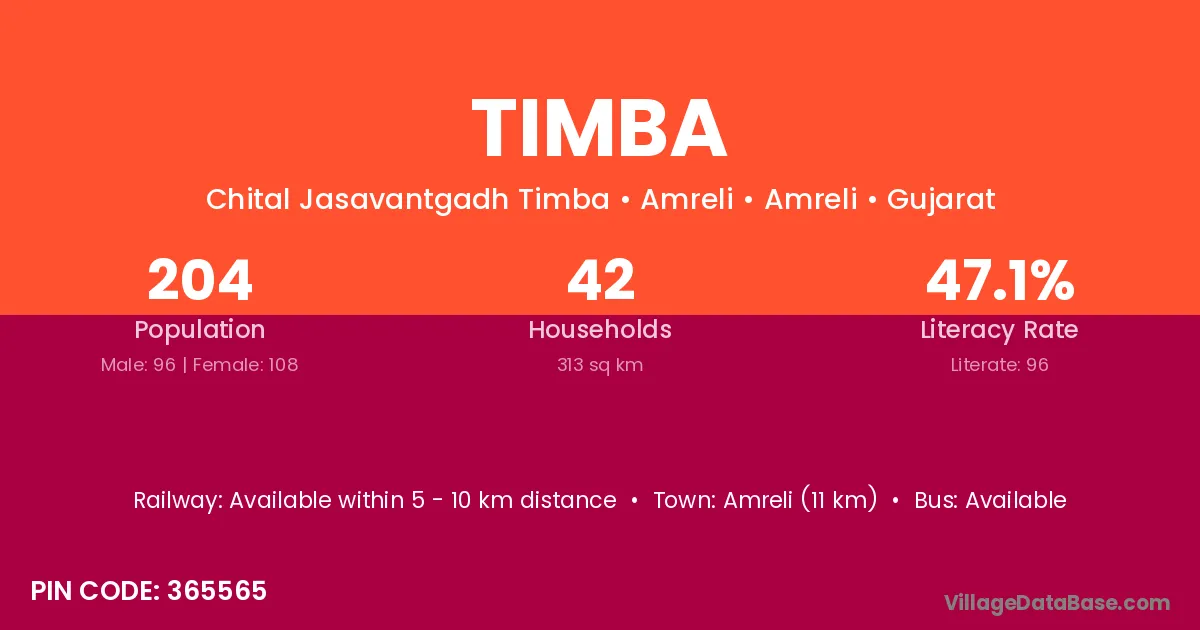 Umrala (9 km) is the nearest town to Timba village for major economic activities and is located approximately 9 km away.
