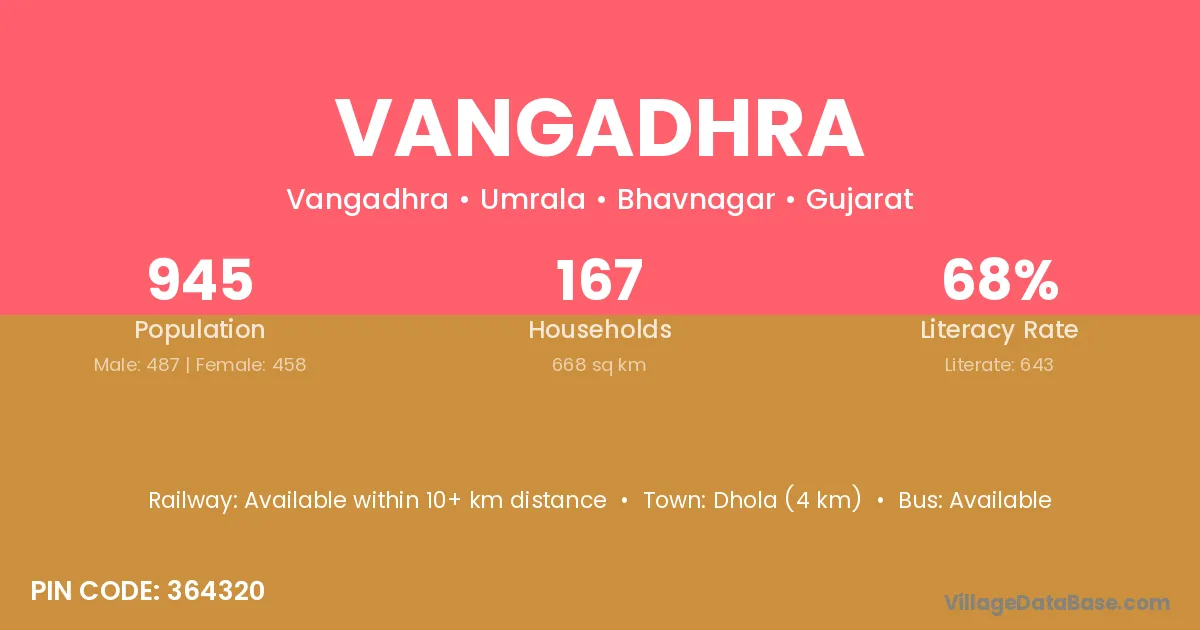 Dhola (4 km) is the nearest town to Vangadhra village for major economic activities and is located approximately 4 km away.