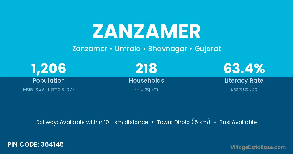 Dhola (5 km) is the nearest town to Zanzamer village for major economic activities and is located approximately 5 km away.