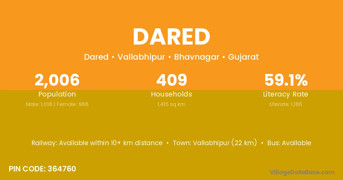 Vallabhipur (22 km) is the nearest town to Dared village for major economic activities and is located approximately 22 km away.