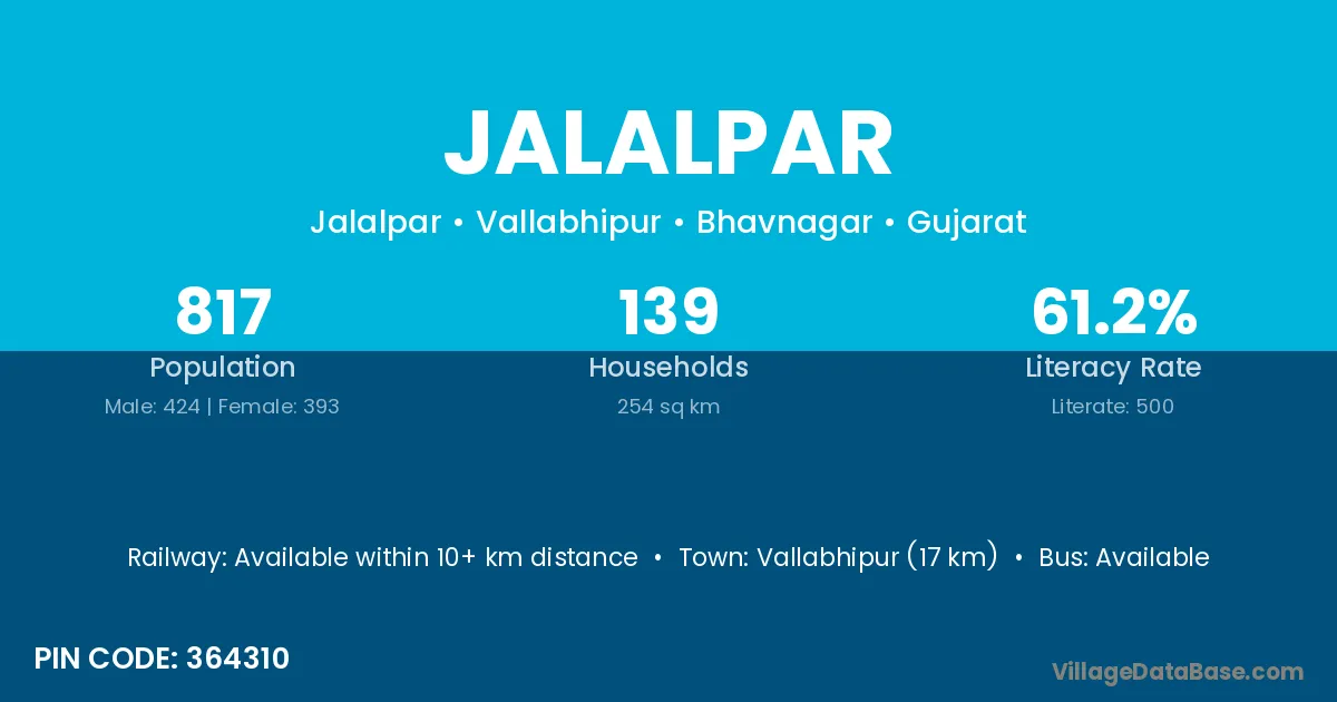 Vallabhipur (17 km) is the nearest town to Jalalpar village for major economic activities and is located approximately 17 km away.