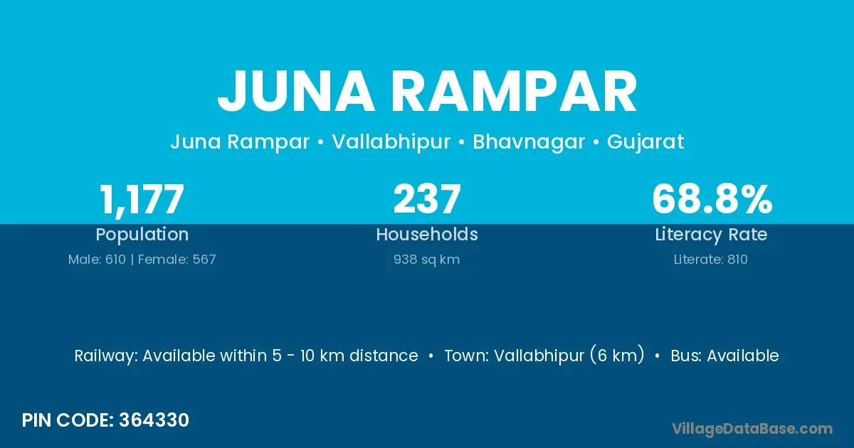 Vallabhipur (6 km) is the nearest town to Juna Rampar village for major economic activities and is located approximately 6 km away.