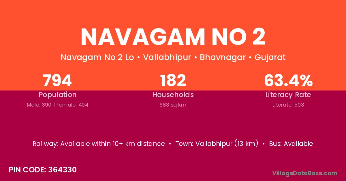 Vallabhipur (13 km) is the nearest town to Navagam No 2 village for major economic activities and is located approximately 13 km away.