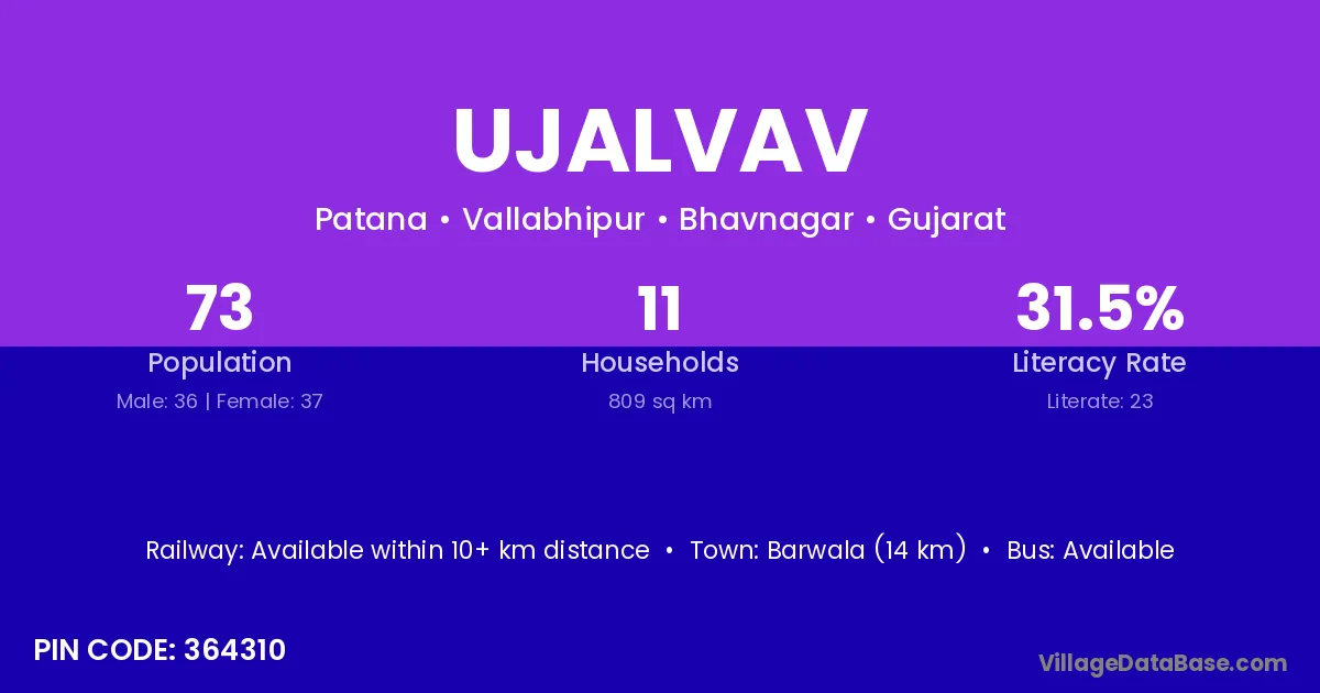 Ujalvav village has a total population of 73 people, of which 36 are males and 37 are females.
