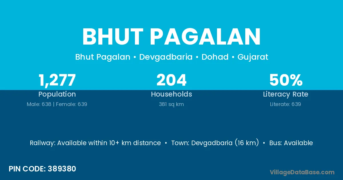 Devgadbaria (16 km) is the nearest town to Bhut Pagalan village for major economic activities and is located approximately 16 km away.