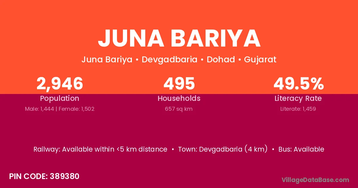 Devgadbaria (4 km) is the nearest town to Juna Bariya village for major economic activities and is located approximately 4 km away.