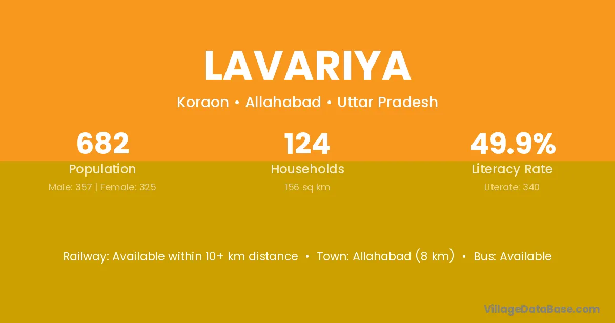 The literacy rate of Lavariya village is 46.74%. Male literacy stands at 58.65% and female literacy at 34.46%.