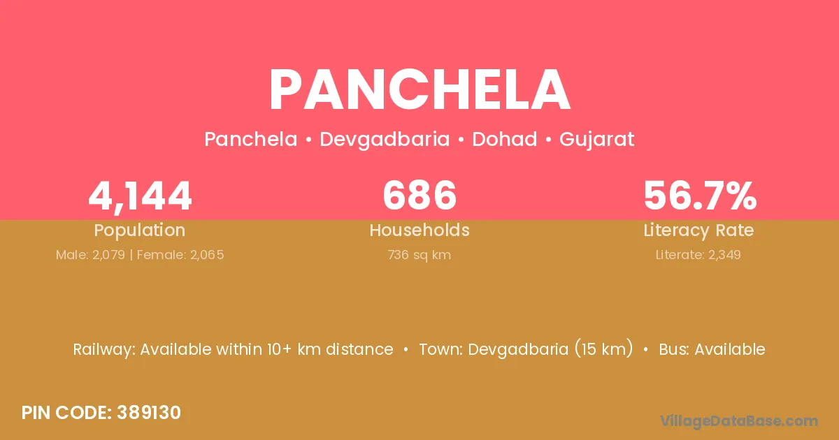 Devgadbaria (15 km) is the nearest town to Panchela village for major economic activities and is located approximately 15 km away.