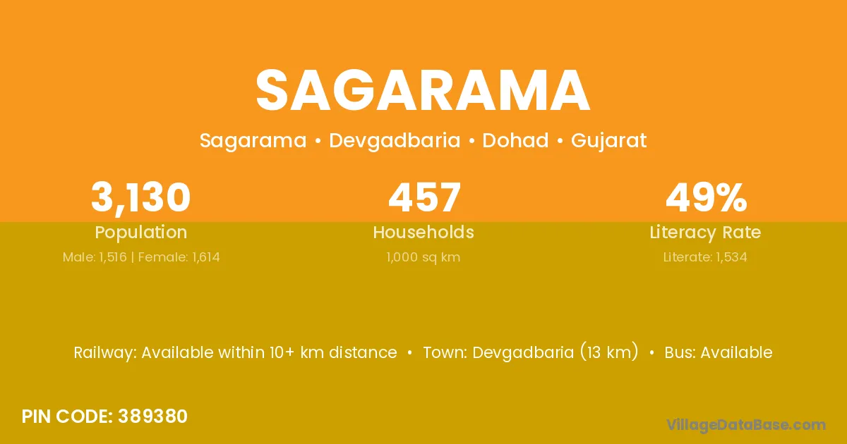 Devgadbaria (13 km) is the nearest town to Sagarama village for major economic activities and is located approximately 13 km away.