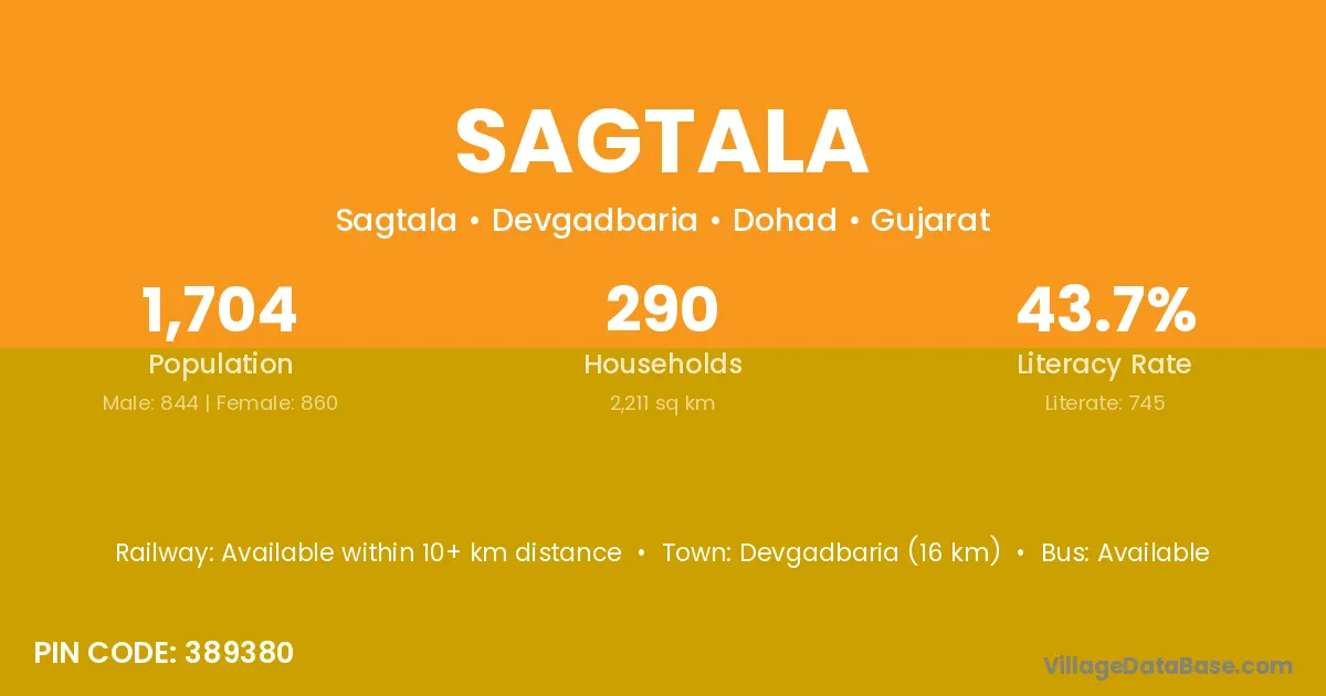 Devgadbaria (16 km) is the nearest town to Sagtala village for major economic activities and is located approximately 16 km away.
