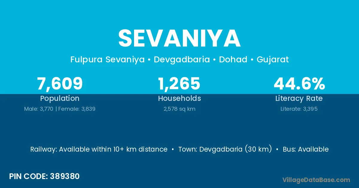 Devgadbaria (30 km) is the nearest town to Sevaniya village for major economic activities and is located approximately 30 km away.