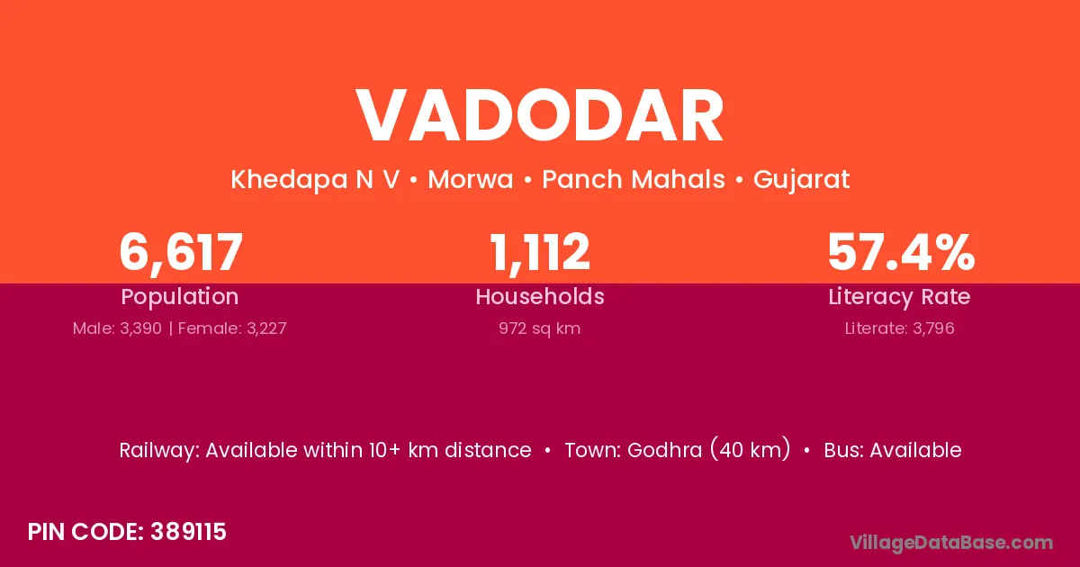 Devgadbaria (19 km) is the nearest town to Vadodar village for major economic activities and is located approximately 19 km away.