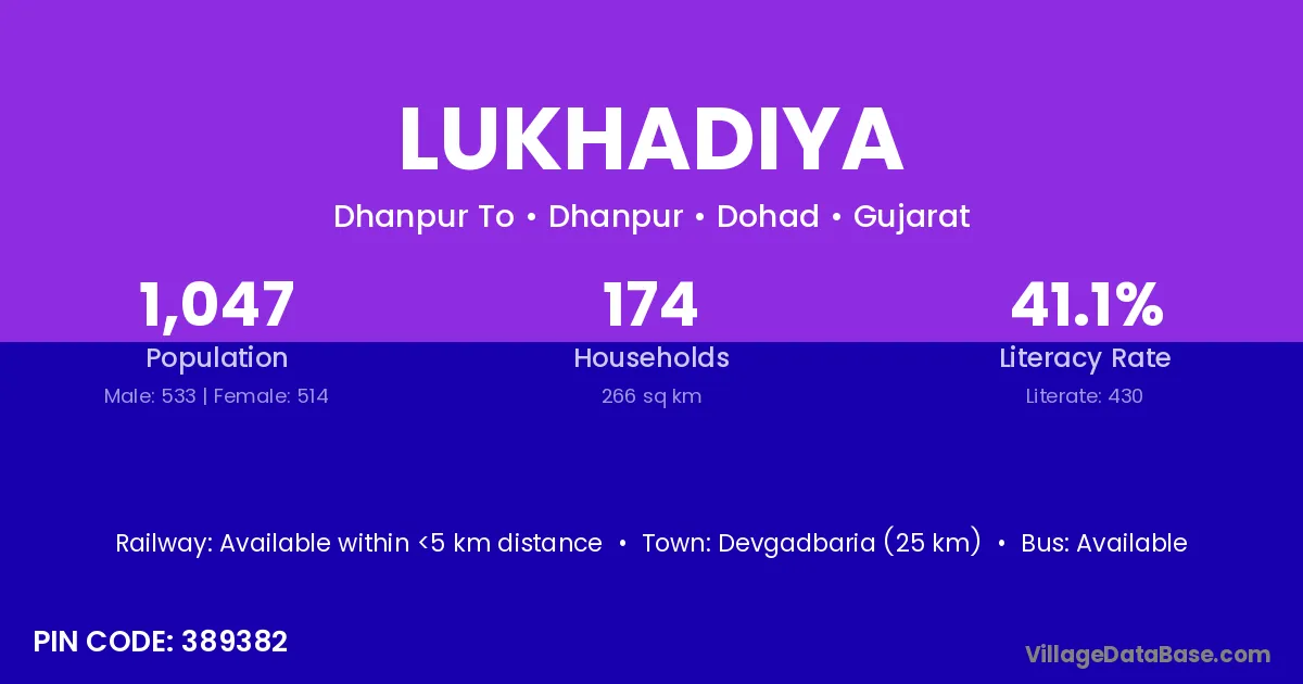 Devgadbaria (25 km) is the nearest town to Lukhadiya village for major economic activities and is located approximately 25 km away.
