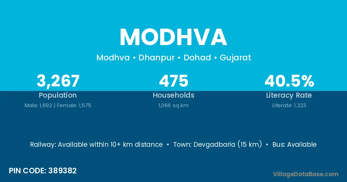 Devgadbaria (15 km) is the nearest town to Modhva village for major economic activities and is located approximately 15 km away.