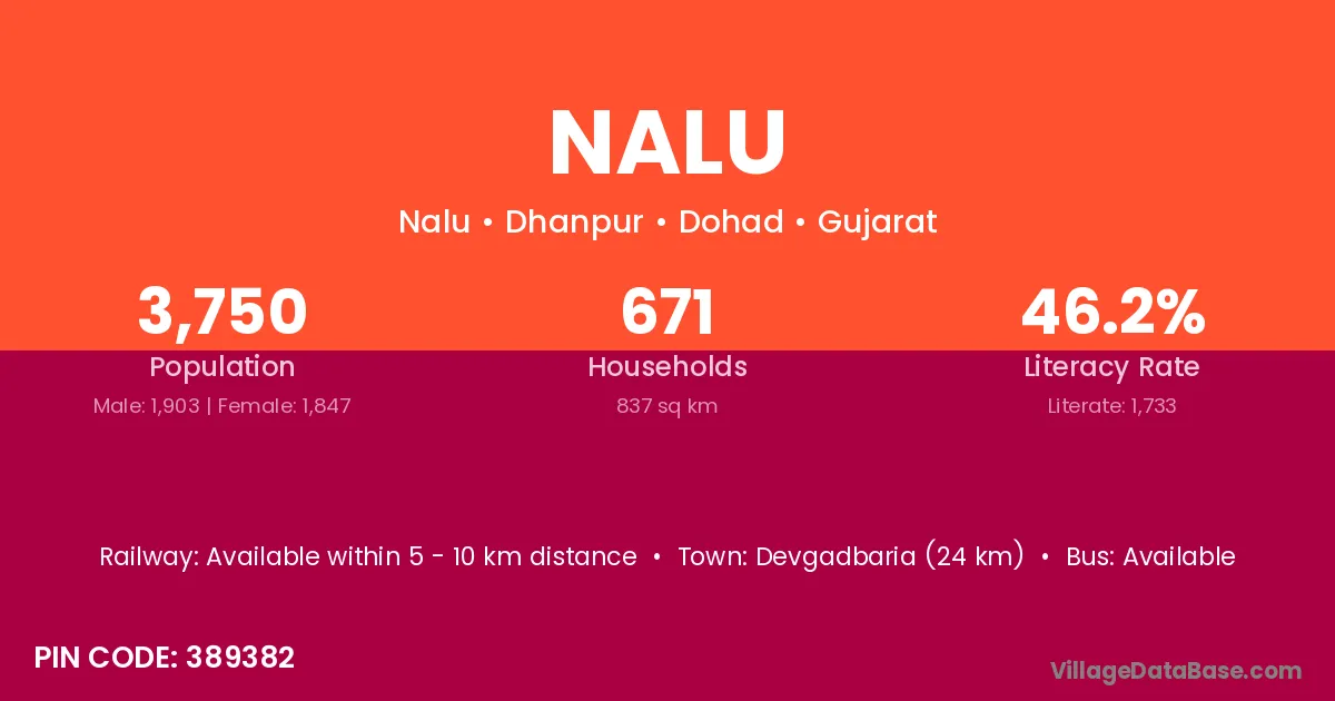 Devgadbaria (24 km) is the nearest town to Nalu village for major economic activities and is located approximately 24 km away.