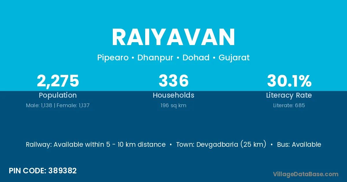 Devgadbaria (25 km) is the nearest town to Raiyavan village for major economic activities and is located approximately 25 km away.
