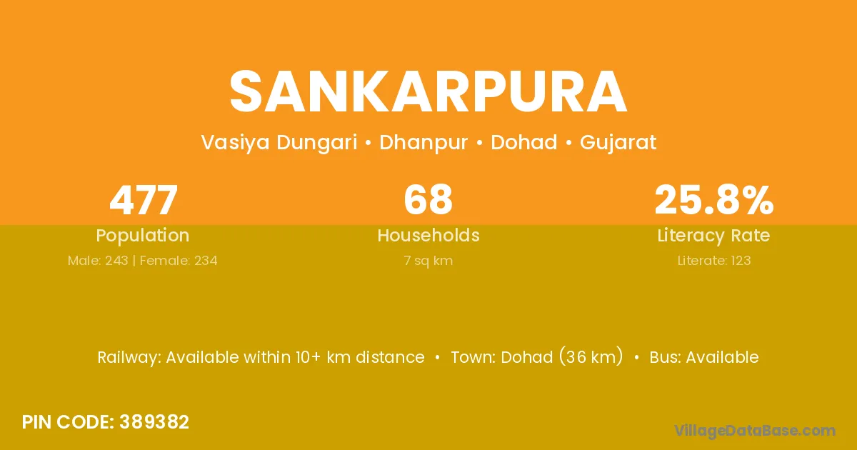 Dohad (36 km) is the nearest town to Sankarpura village for major economic activities and is located approximately 36 km away.