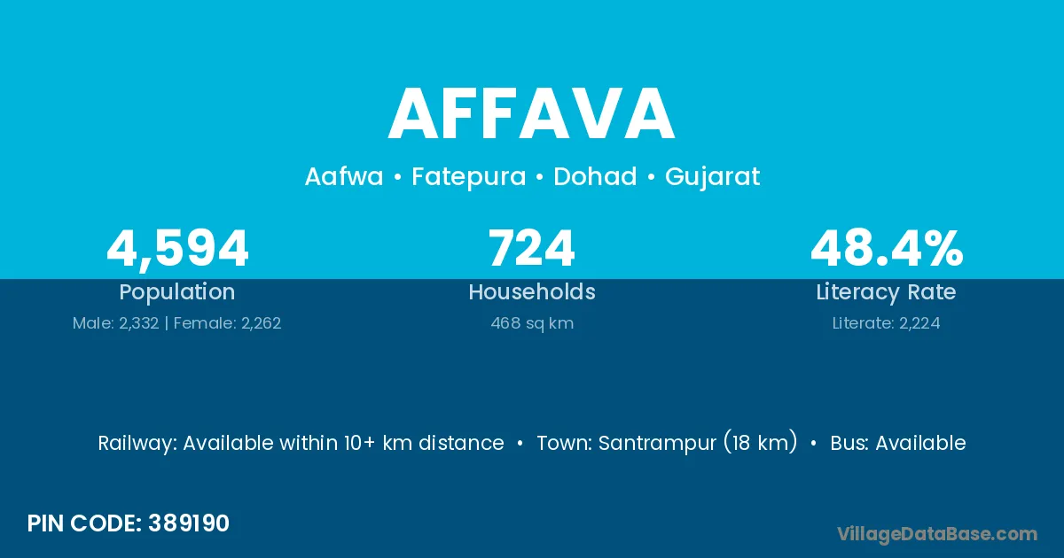 Santrampur (18 km) is the nearest town to Affava village for major economic activities and is located approximately 18 km away.