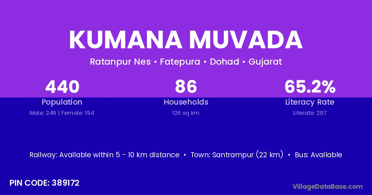 Santrampur (22 km) is the nearest town to Kumana Muvada village for major economic activities and is located approximately 22 km away.