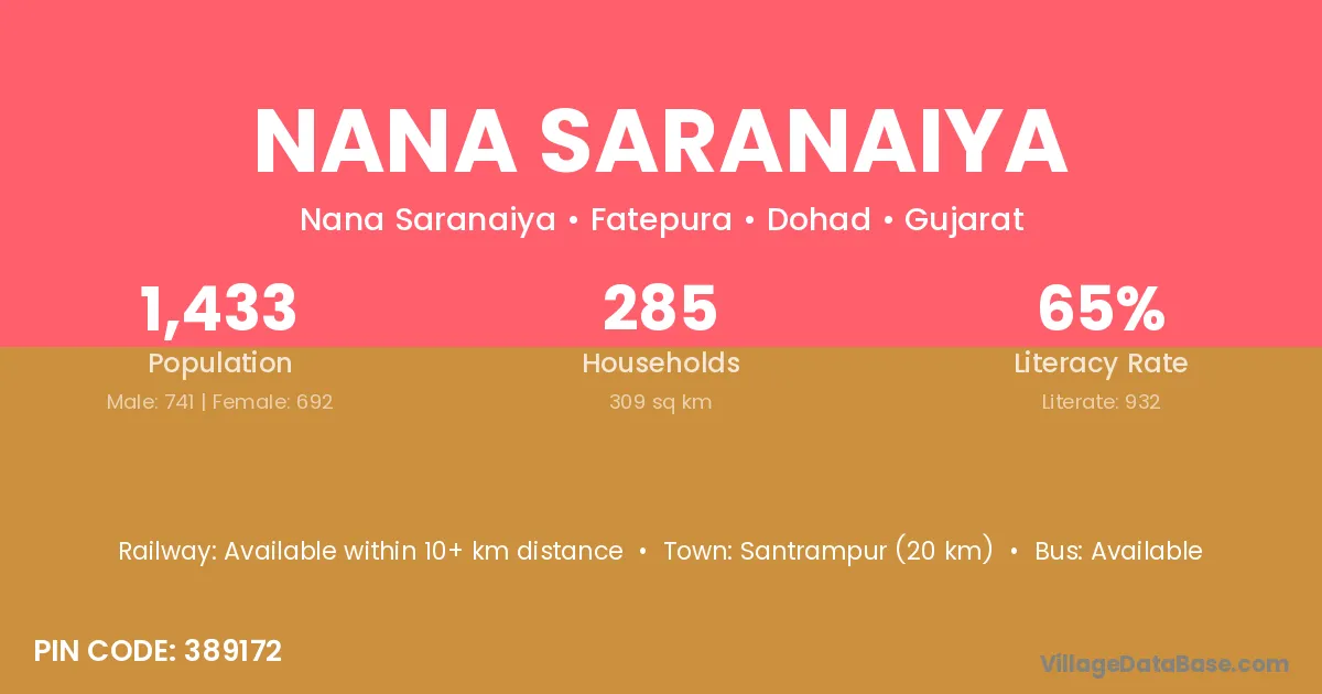 Santrampur (20 km) is the nearest town to Nana Saranaiya village for major economic activities and is located approximately 20 km away.