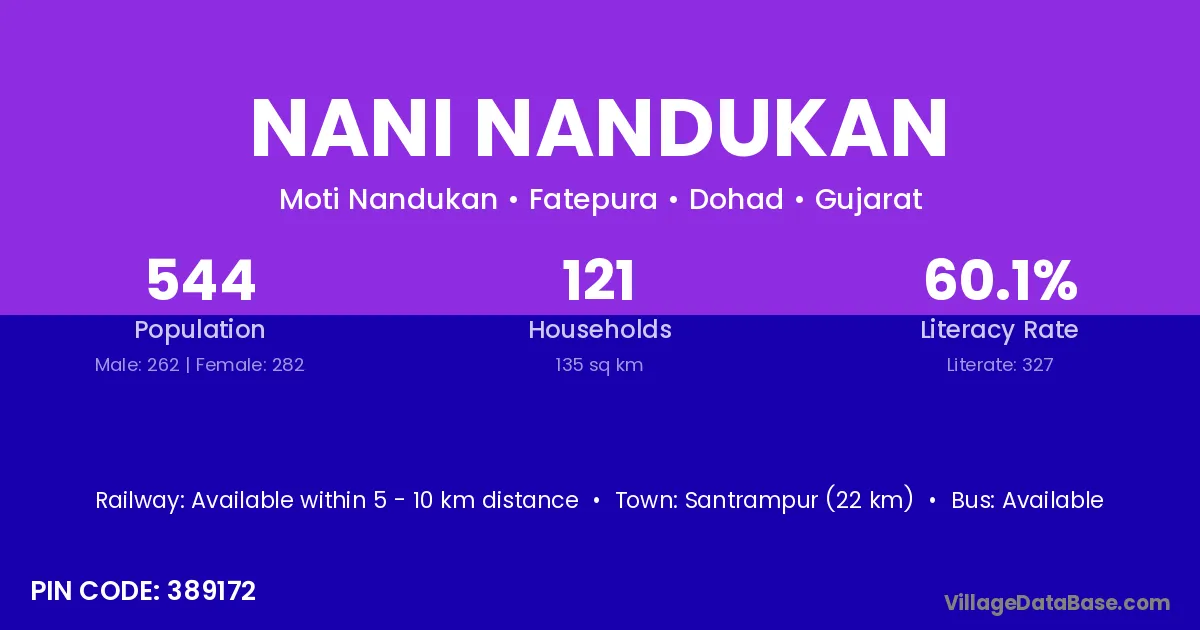 Santrampur (22 km) is the nearest town to Nani Nandukan village for major economic activities and is located approximately 22 km away.