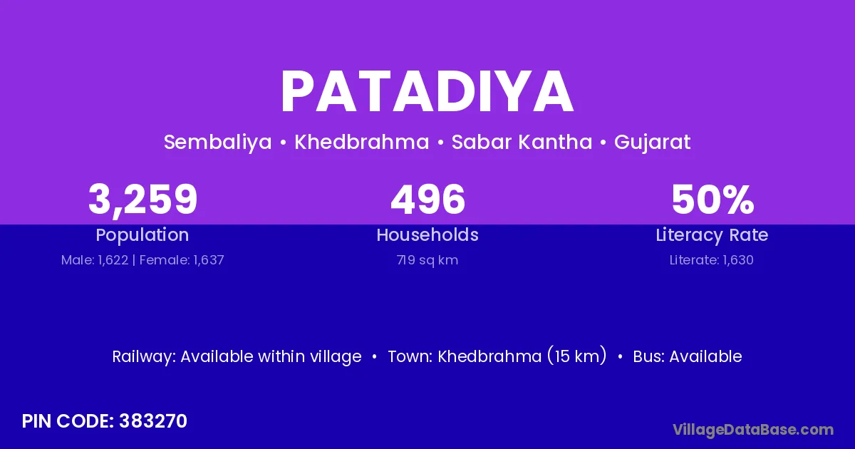 According to Census 2011 information, the village code of Patadiya village is 389172.