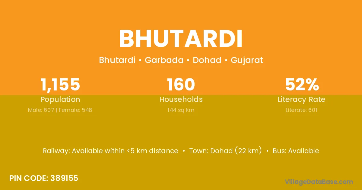 Dohad (22 km) is the nearest town to Bhutardi village for major economic activities and is located approximately 22 km away.