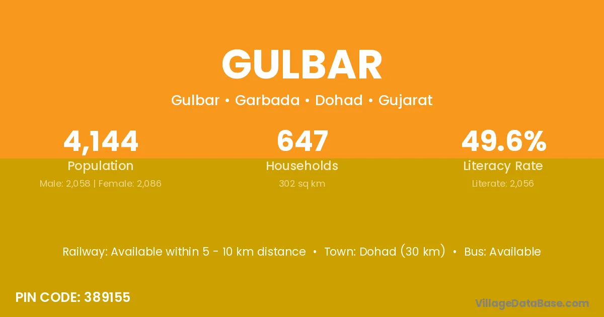 Dohad (30 km) is the nearest town to Gulbar village for major economic activities and is located approximately 30 km away.