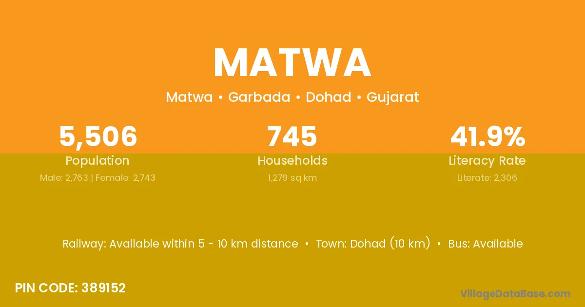 Dohad (10 km) is the nearest town to Matwa village for major economic activities and is located approximately 10 km away.