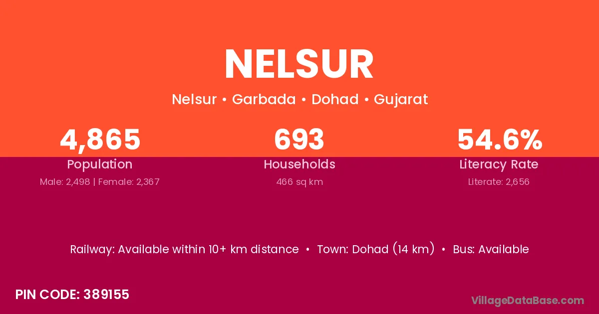 Dohad (14 km) is the nearest town to Nelsur village for major economic activities and is located approximately 14 km away.