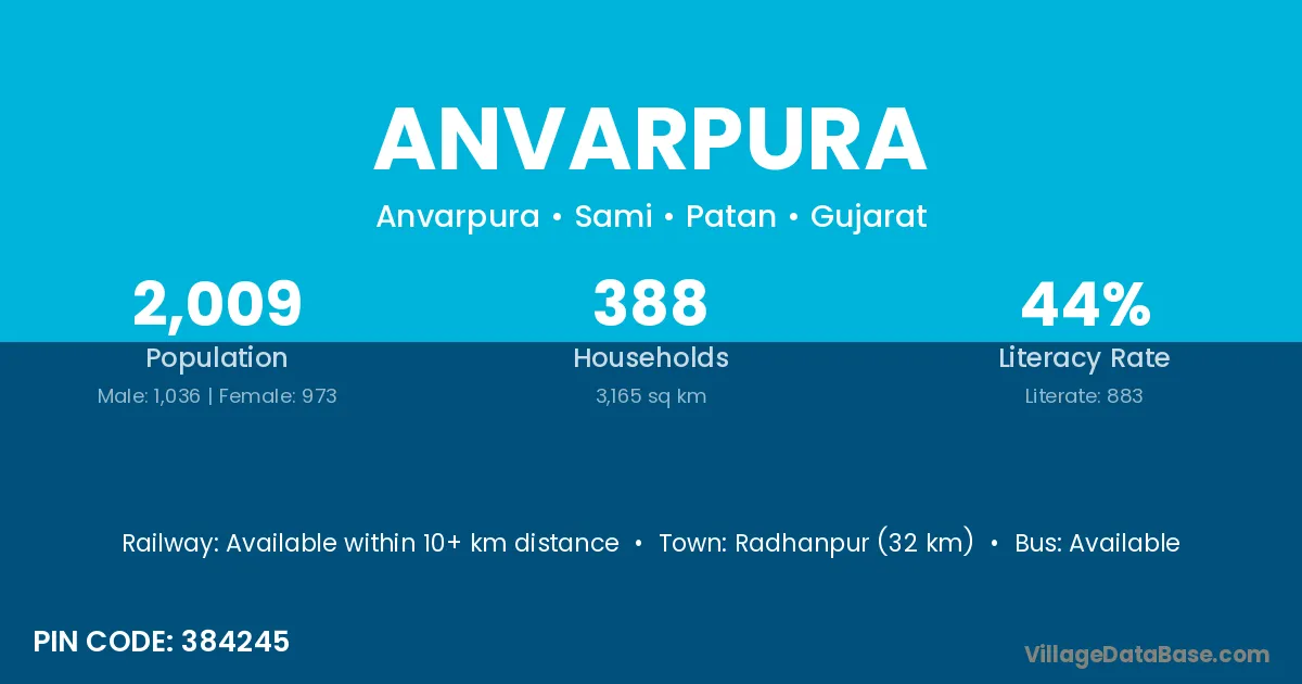Anvarpura village has a total population of 1,908 people, of which 977 are males and 931 are females.