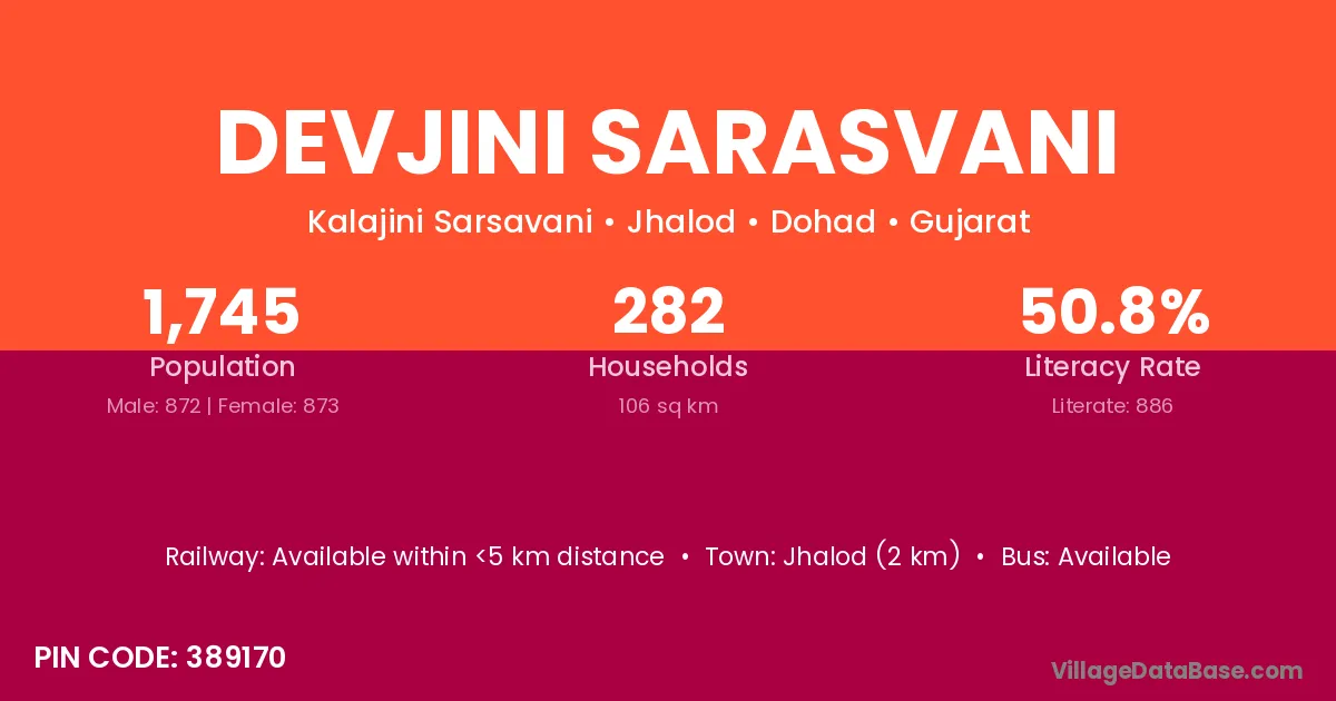 Jhalod (2 km) is the nearest town to Devjini Sarasvani village for major economic activities and is located approximately 2 km away.
