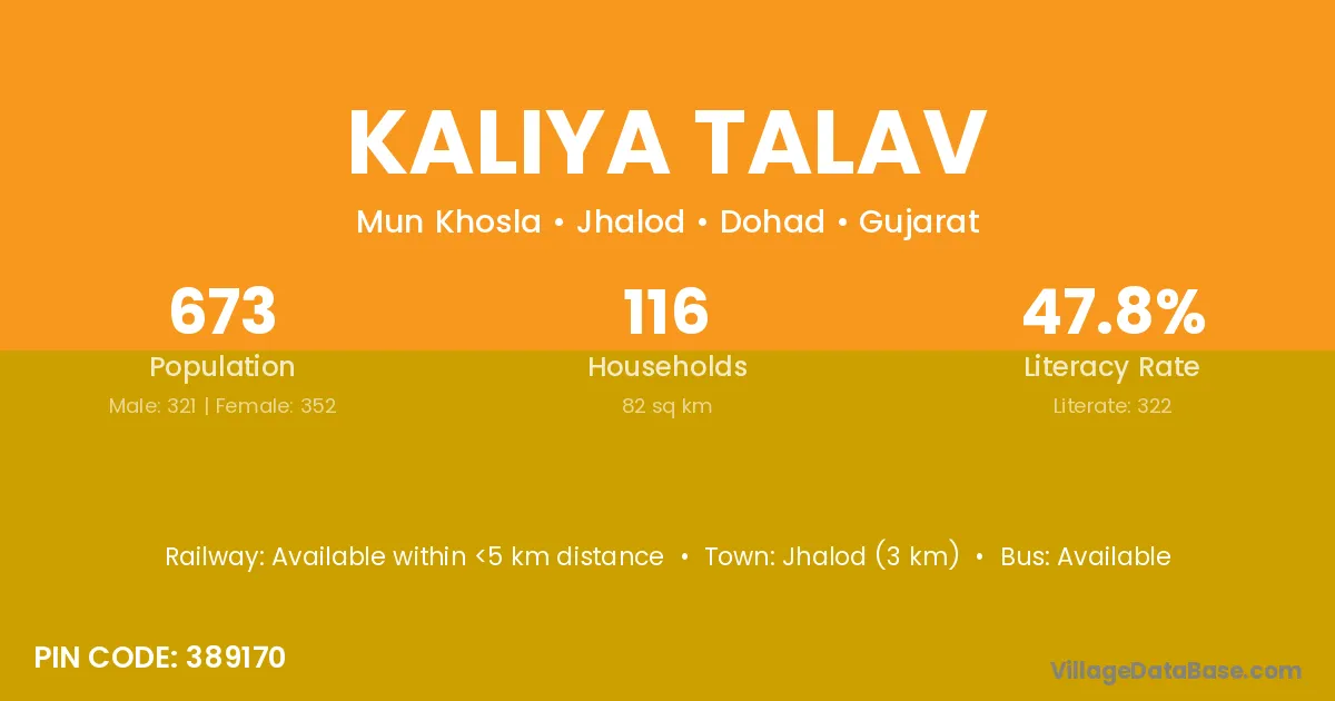Jhalod (3 km) is the nearest town to Kaliya Talav village for major economic activities and is located approximately 3 km away.