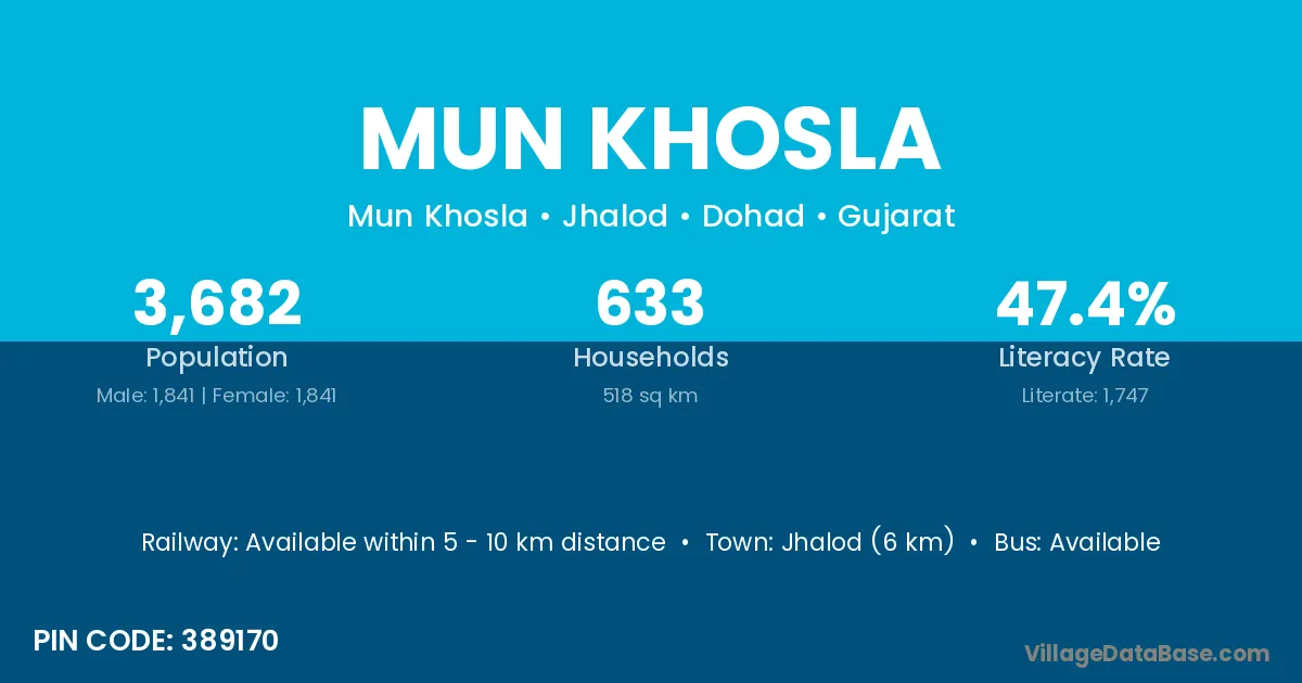 Jhalod (6 km) is the nearest town to Mun Khosla village for major economic activities and is located approximately 6 km away.