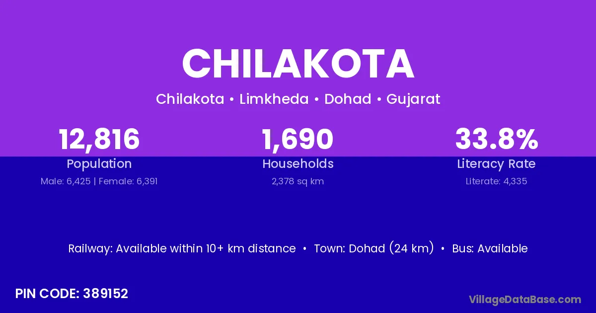 Dohad (24 km) is the nearest town to Chilakota village for major economic activities and is located approximately 24 km away.