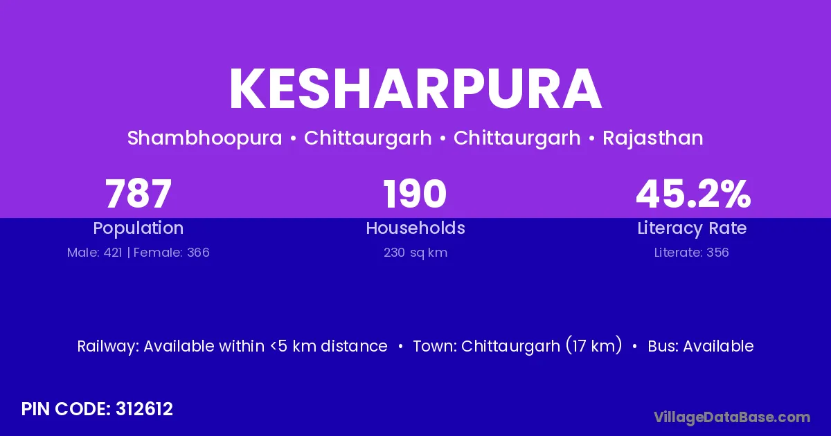 Limkheda (15 km) is the nearest town to Kesharpura village for major economic activities and is located approximately 15 km away.