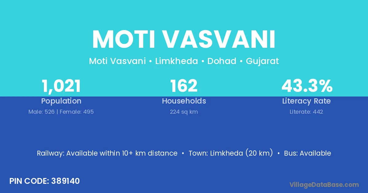 Limkheda (20 km) is the nearest town to Moti Vasvani village for major economic activities and is located approximately 20 km away.