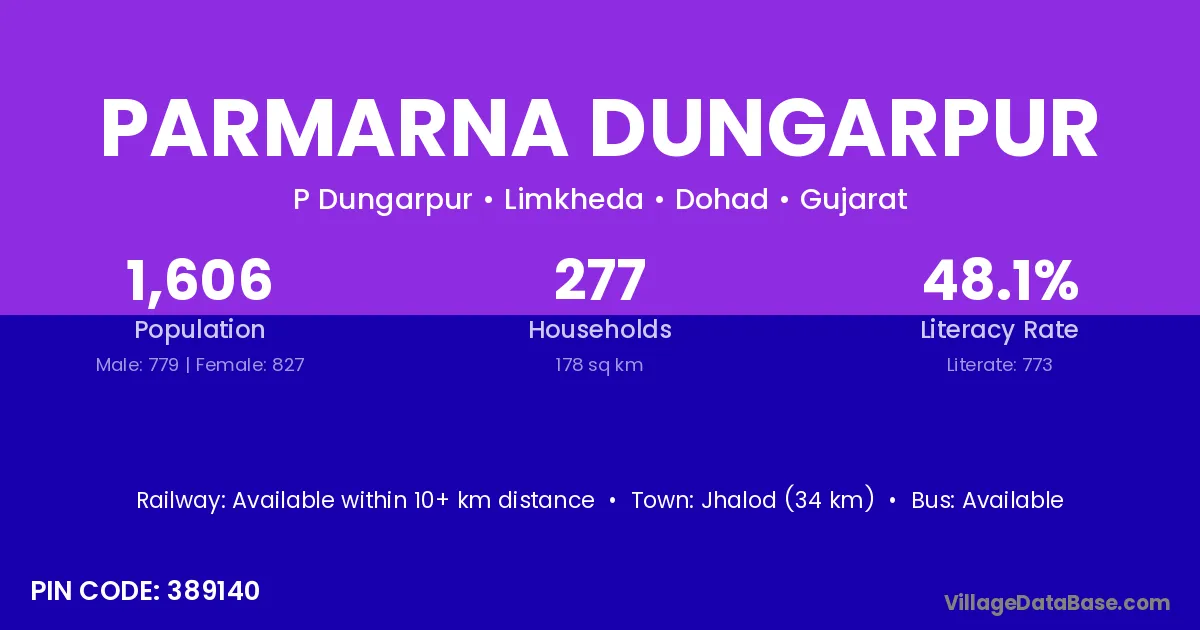 Jhalod (34 km) is the nearest town to Parmarna Dungarpur village for major economic activities and is located approximately 34 km away.