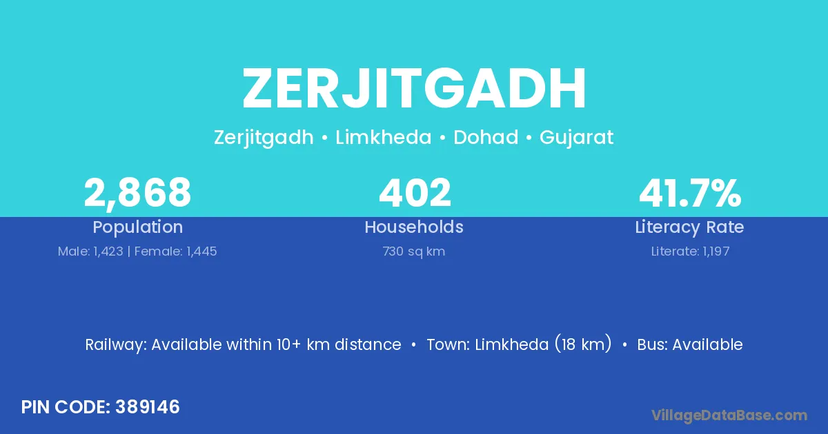 Limkheda (18 km) is the nearest town to Zerjitgadh village for major economic activities and is located approximately 18 km away.