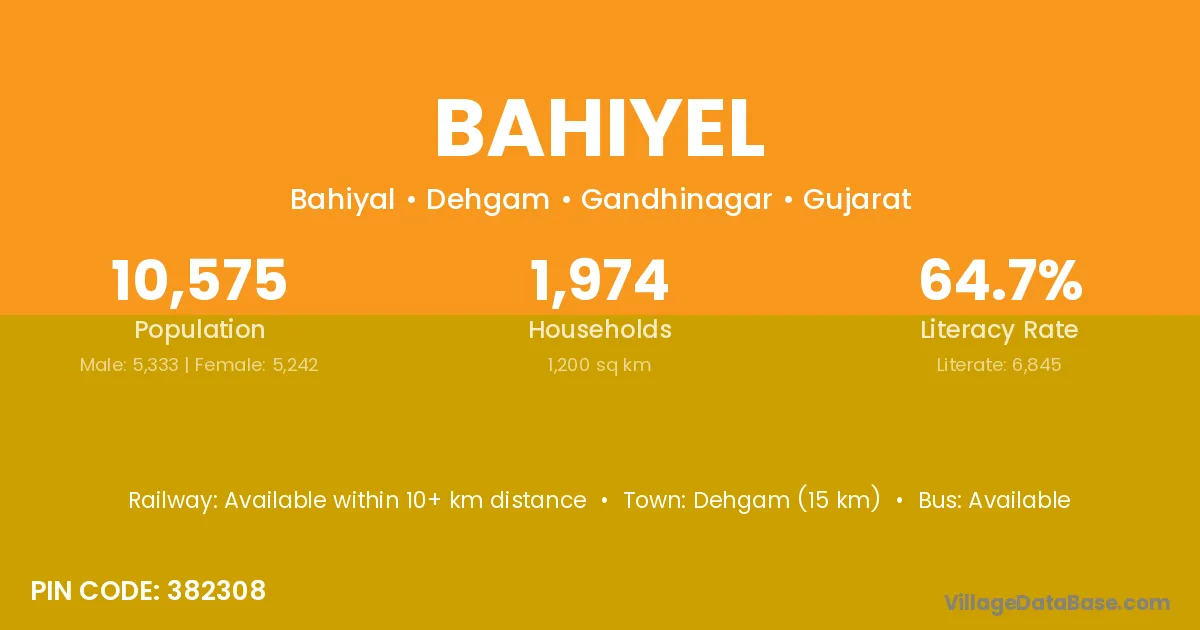 Dehgam (15 km) is the nearest town to Bahiyel village for major economic activities and is located approximately 15 km away.