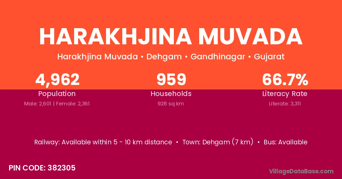 Dehgam (7 km) is the nearest town to Harakhjina Muvada village for major economic activities and is located approximately 7 km away.