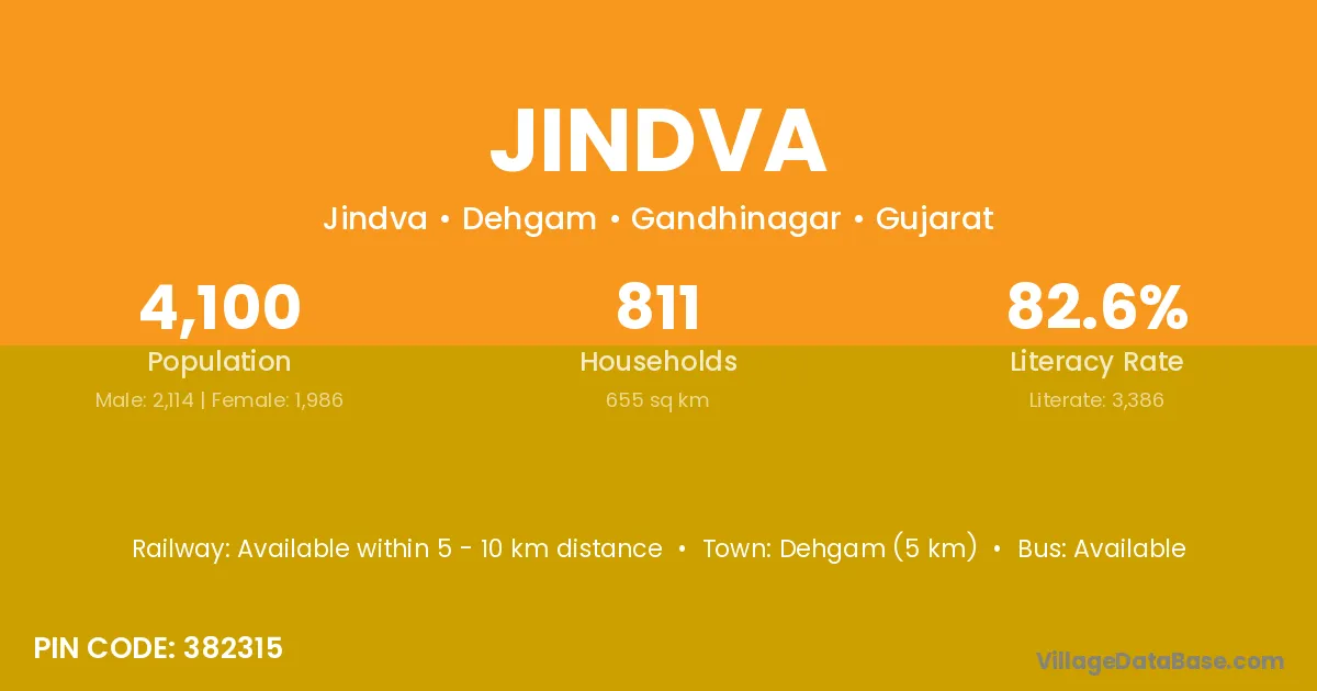 Dehgam (5 km) is the nearest town to Jindva village for major economic activities and is located approximately 5 km away.