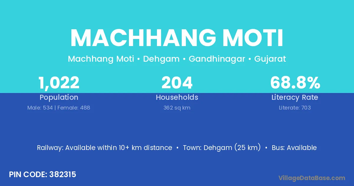 Dehgam (25 km) is the nearest town to Machhang Moti village for major economic activities and is located approximately 25 km away.