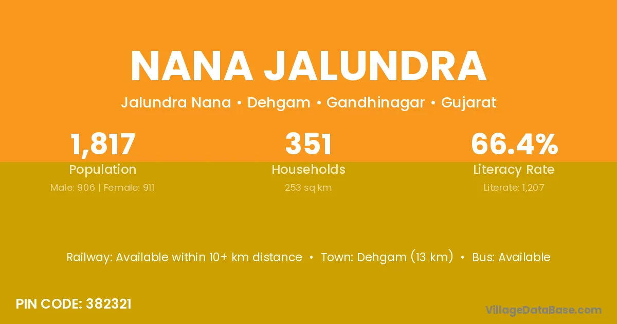 Dehgam (13 km) is the nearest town to Nana Jalundra village for major economic activities and is located approximately 13 km away.