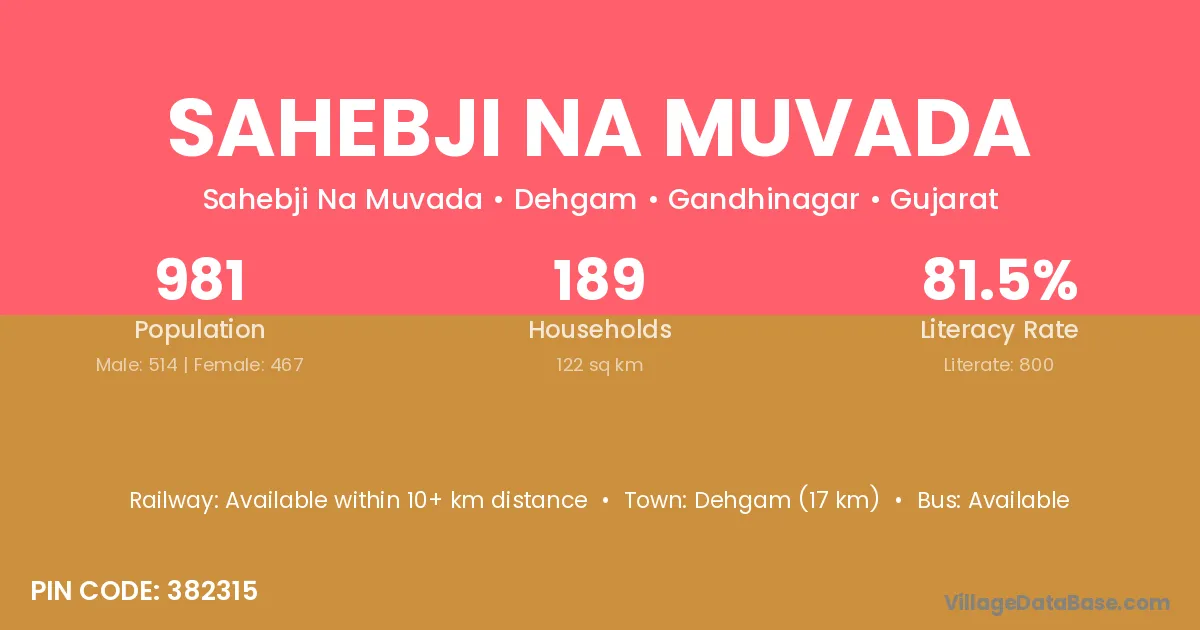 Dehgam (17 km) is the nearest town to Sahebji Na Muvada village for major economic activities and is located approximately 17 km away.