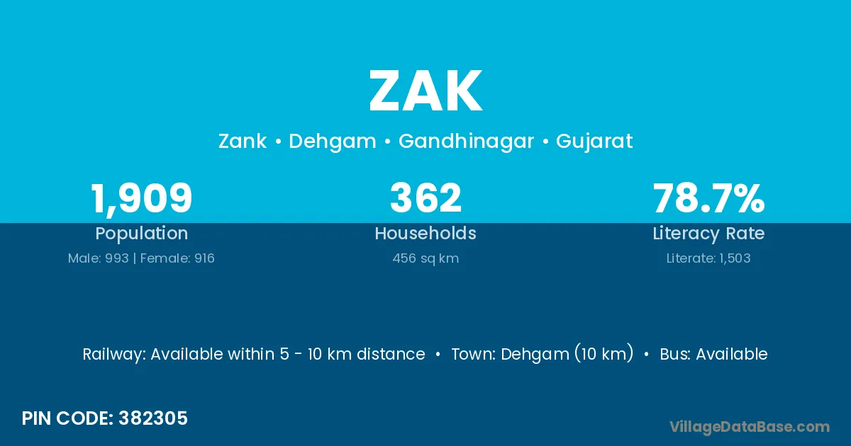Dehgam (10 km) is the nearest town to Zak village for major economic activities and is located approximately 10 km away.