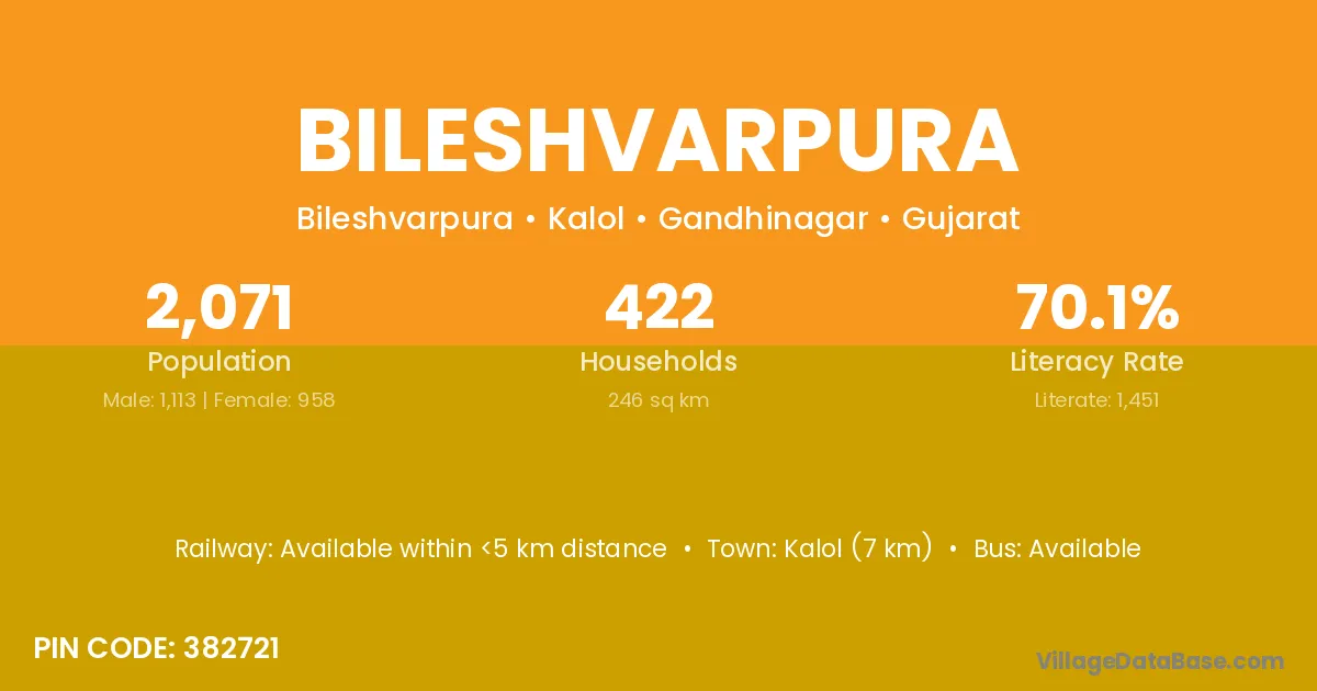 Kalol (7 km) is the nearest town to Bileshvarpura village for major economic activities and is located approximately 7 km away.