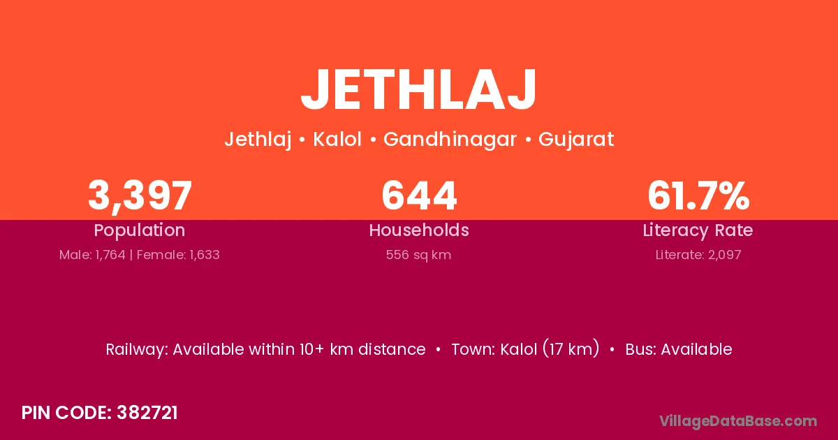 Kalol (17 km) is the nearest town to Jethlaj village for major economic activities and is located approximately 17 km away.